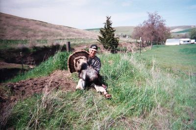 4:am came awful early but we were up and anxious to get out into the field. We arrived at the hunting location in the foothills of the Blue Mountains about 45 minutes before sunrise. We gave a crow call and listened for the answer. Gobbles to the North and West, we decided to go West. We setup under a fence line and started calling. We had several answers from Gobblers still in the roost. As the sun climbed higher the gobblers began to fly with a couple landing in our direction. We were hearing some behind us and assumed it was Daniels hunting partners that were suppose to join us. We had one Tom that came with in 75 yards but not close enough.