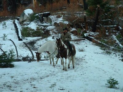 About 3 miles from the truck we ran across another hunter in a truck that agreed to call for help when he got into cell range or into town, whichever came first. We headed back to the truck and trailer and started a fire and made breakfast. An hour or 2 later a wildlife agent showed up and said he had run into the hunter we had seen. He radioed for a tow truck and a truck with a 5th wheel hitch. It was late afternoon when they finally reached us. We helped chain up both rigs front and back and we headed out. We made it to the main road by 9:30pm. They had called a local outfitter for permission to keep our horses and trailer at his place. He was a great guy and offered a trailer for us to sleep in by the horse pens. He also gave us a truck to drive for what ever purpose we needed.